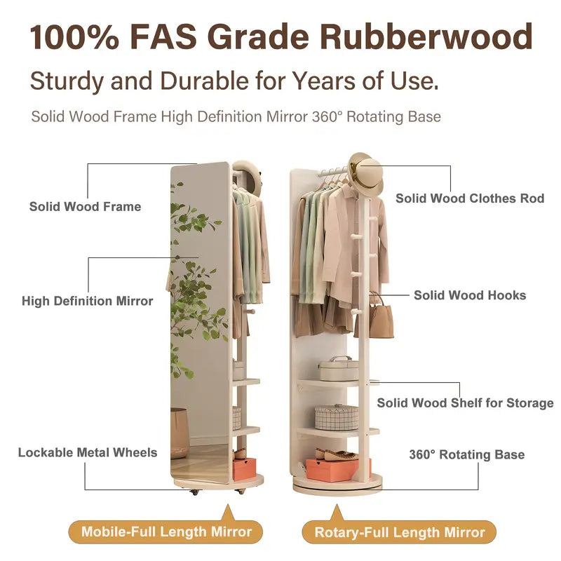 D✨ Specchio da Terra in Legno Massiccio – Girevole con Appendiabiti! 🪞