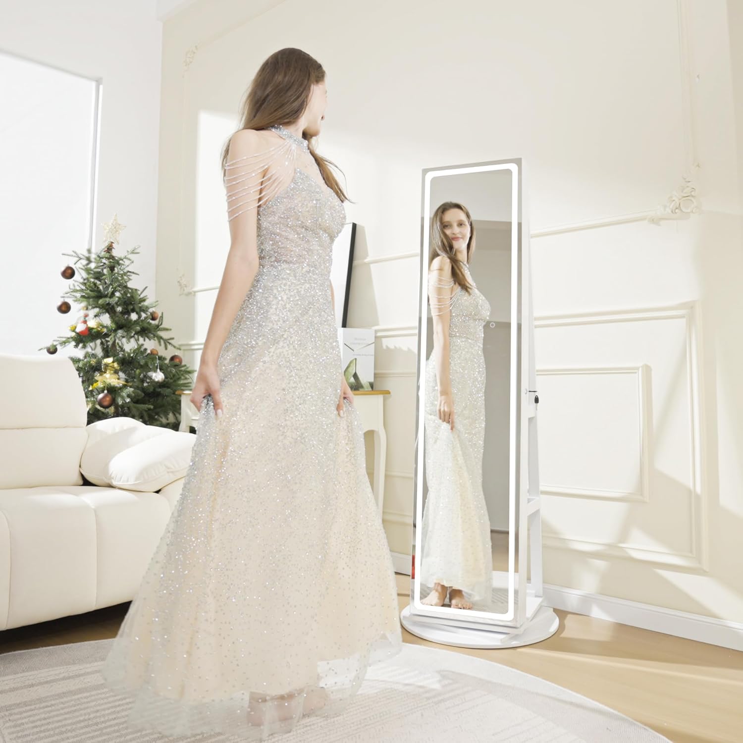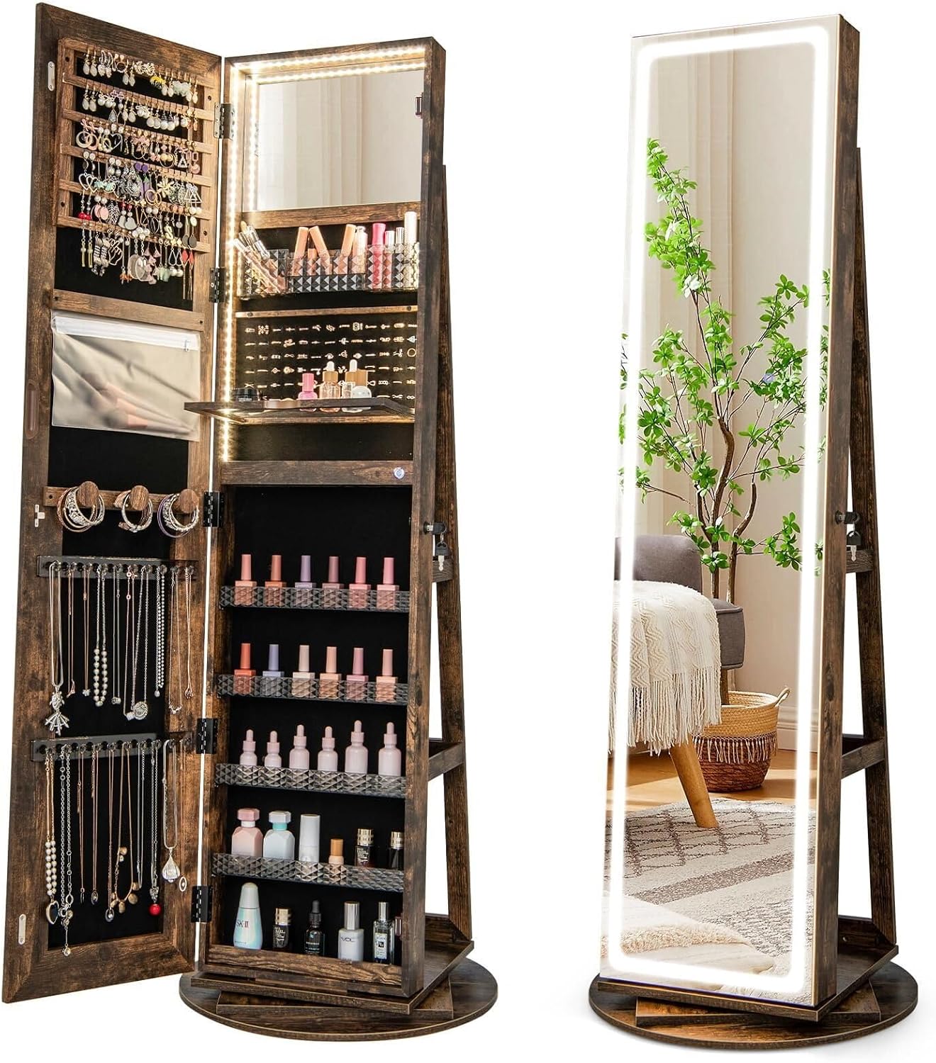 Specchio a Figura Intera con Luci LED Regolabili – Questo armadio portagioie girevole è dotato di uno specchio a figura intera con luci LED dimmerabili, con 3 tonalità di luce e funzione di memoria intelligente. Tramite il pulsante touch puoi trovare l’illuminazione perfetta per controllare il tuo aspetto.