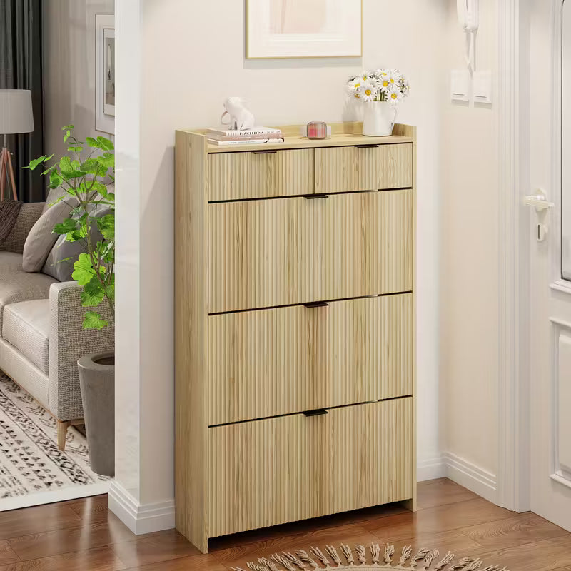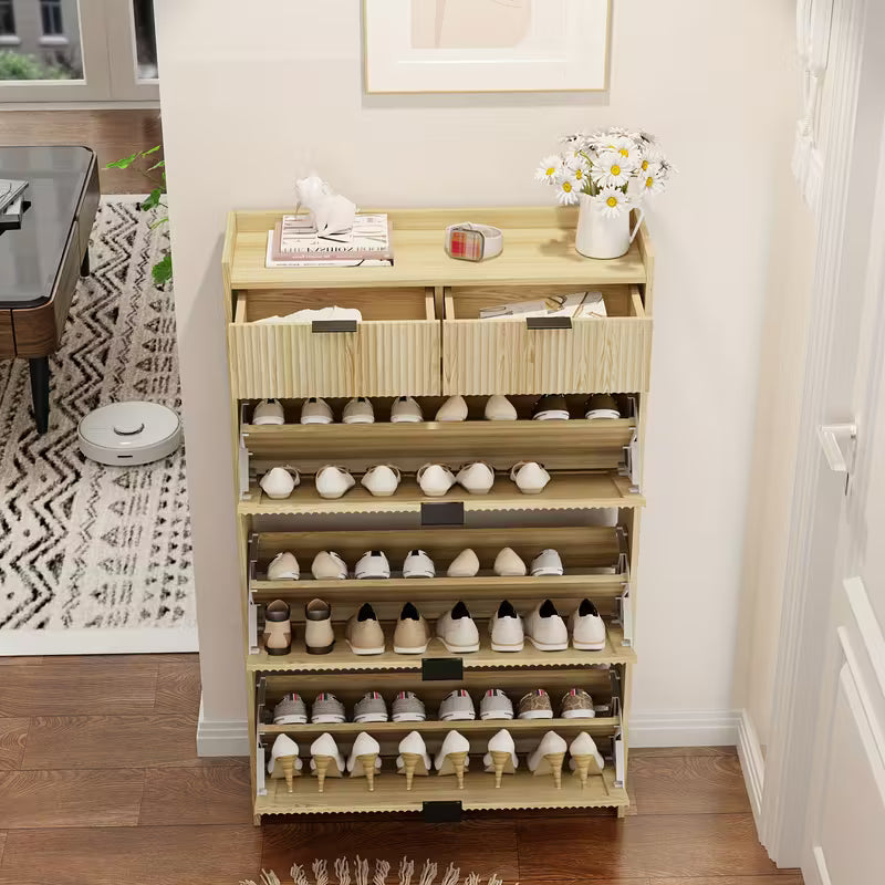 Spazioso e Versatile: Tre cassetti ribaltabili con due livelli ciascuno, più due cassetti superiori per piccoli oggetti, offrono ampio spazio per scarpe di tutte le dimensioni. Le partizioni centrali regolabili o rimovibili consentono di organizzare facilmente diversi tipi di calzature.